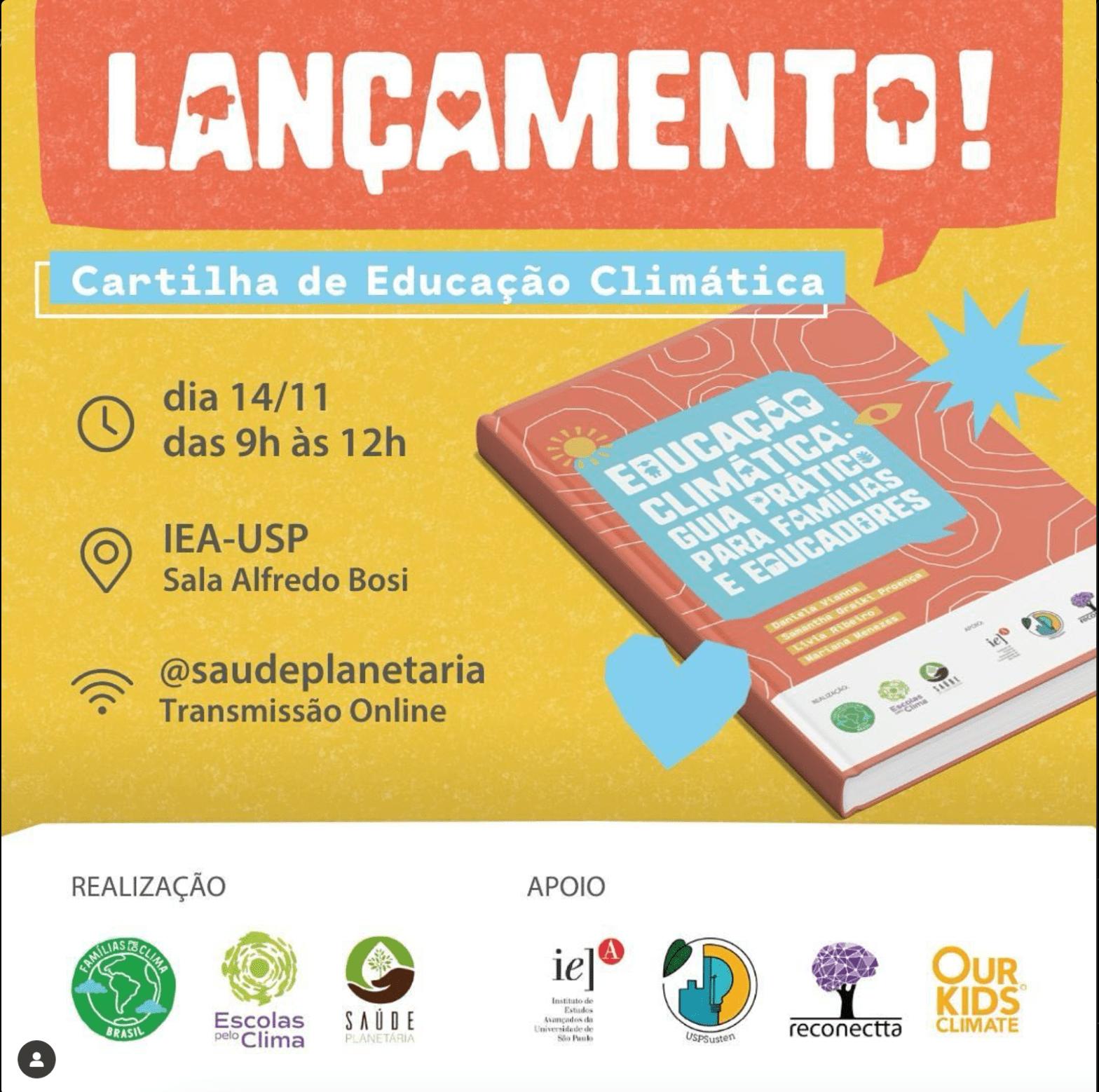 No próximo dia 14 de novembro, das 9h às 12h, será lançada a cartilha “Educação Climática: Guia Prático para Famílias e Educadores”. O evento híbrido será realizado presencialmente na sala Alfredo Bosi, no Instituto de Estudos Avançados da USP (IEA-USP), na Cidade Universitária, em São Paulo, com transmissão online ao vivo pelo canal do YouTube do Saúde Planetária Brasil – clique aqui para acessar.